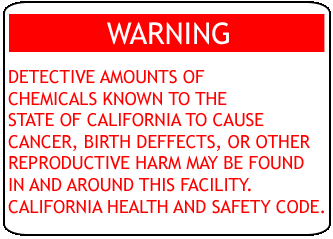 WARNING DETECTIVE AMOUNTS OF CHEMICALS KNOWN TO THE STATE OF CALIFORNIA TO CAUSE CANCER, BIRTH DEFFECTS, OR OTHER REPRODUCTIVE HARM MAY BE FOUND IN AND AROUND THIS FACILITY. CALIFORNIA HEALTH AND SAFETY CODE.
