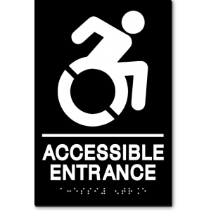 An ADA-compliant braille accessible entrance sign as Code Compliant for New York and Connecticut. Constructed from durable, vandal-proof, high-impact CAD-cut acrylic. Sign dimensions size: 6 inches wide x 9 inches high x 1/16 inches thick with square corners. Tactile graphics raised 1/32 inch above base. Easy-to-read lettering in a high-contrast color, 5/8 inch tall Grade...