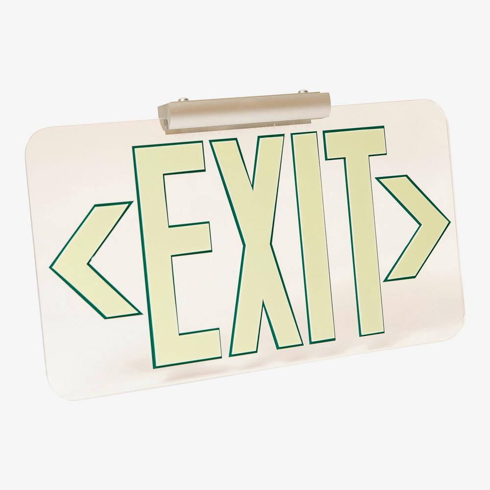 All new crafted clear photoluminscent exit emergency light.  Features a modern design for elegance and durability. It is constructed using poly metal material and is ideal for primary high and low level applications. Universal mounting bracket makes installation easy. It has field applied directional arrows, Charges by ambient light from LED, fluorescent, metal halide and mercury vapor.  Approved in all 50 states